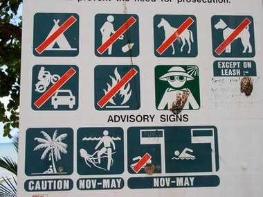 最後一天,毫無潛水價值,甚至有人不潛水了,離譜的是,連導潛都不潛了,還很有理由的說,照慣例,最後一天他們都不潛水。我無法想像這裡的花費與品質上的落差,是否值得讓人再來? 海底水況不佳,水母很多,看看海邊的告示牌,也許,你就了解了。